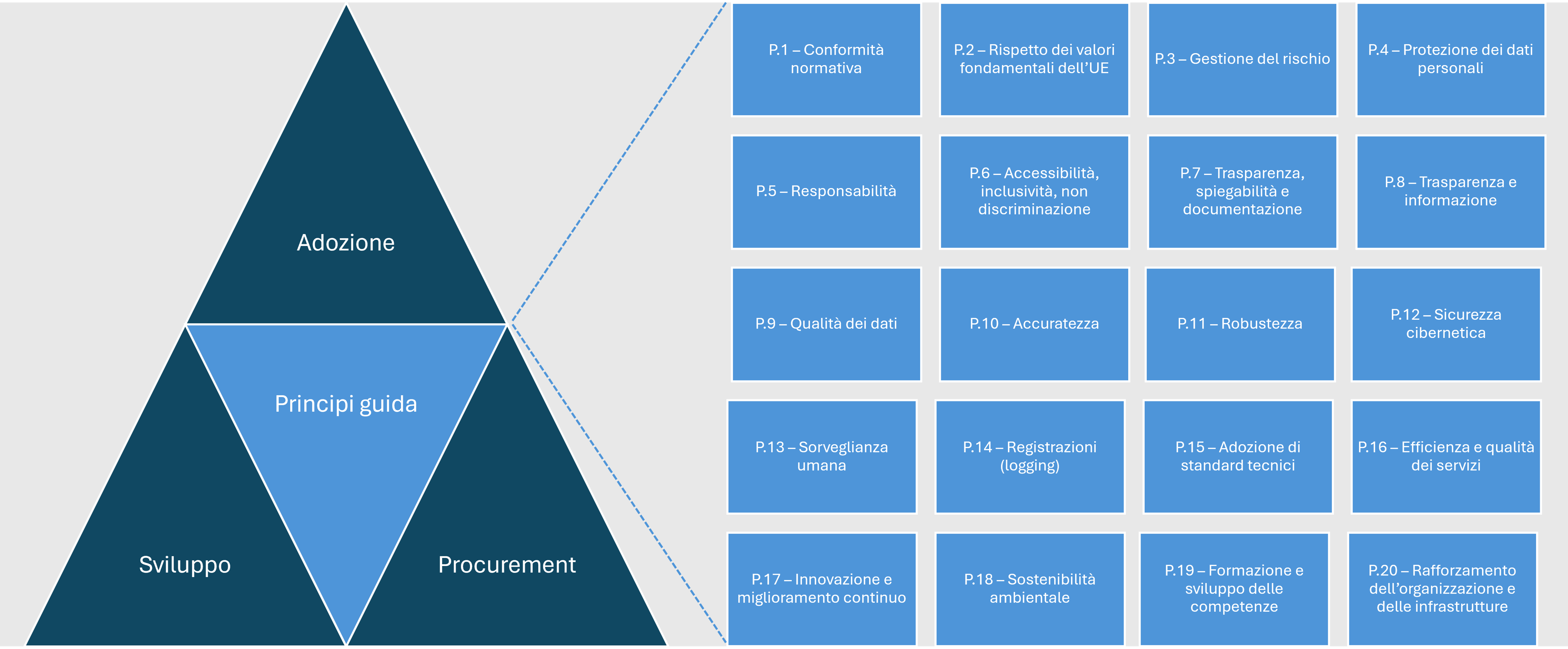 Le linee guida individuano 20 principi che collegano le tre dimensioni fondamentali dell’intelligenza artificiale nella PA: adozione, sviluppo e procurement